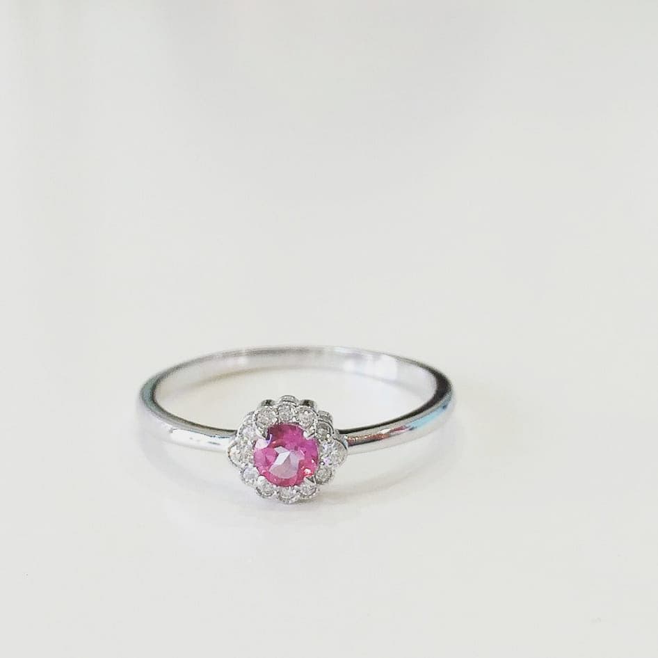 Anillo realizado en oro blanco de 375mls, diamantes ecológicos talla brillante y topacio rosa natural extra.