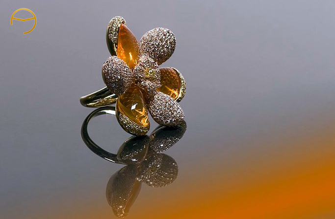 Oro amarillo de 750mls. 3 Opalos 13.99 Ct. 4 Diamantes rosas 0.75Ct y amarillos 0.82 Ct. 353 Diamantes blancos 1.91 Ct.